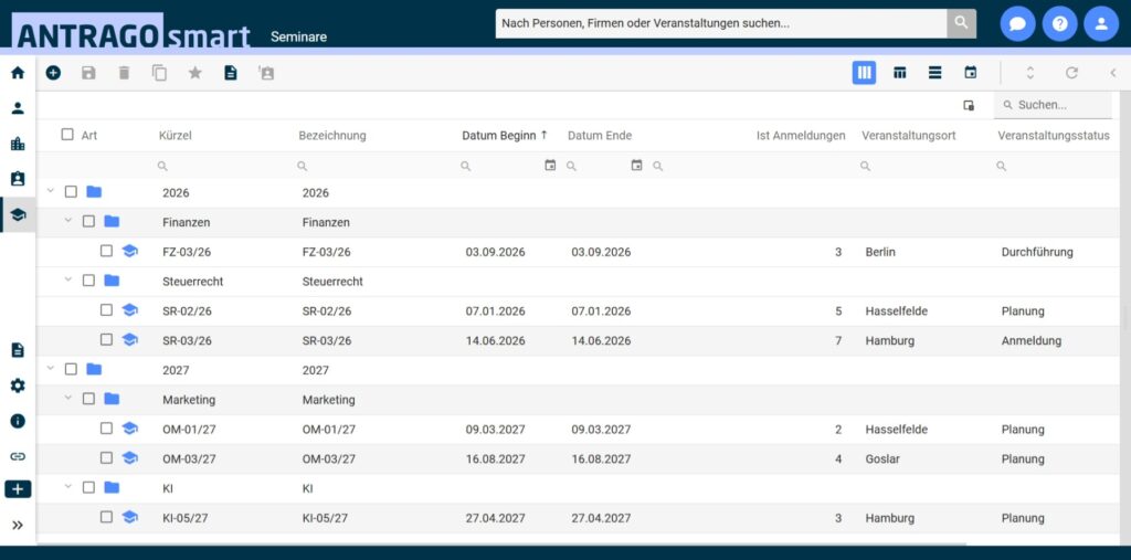 Flexible Veranstaltungsstruktur – so wie Sie arbeiten: Jede Organisation strukturiert Veranstaltungen anders. Manche denken in Formaten, andere in Jahren, Themen oder Zielgruppen. ANTRAGO smart gibt keine feste Logik vor – Sie bilden Ihre eigene Struktur ab.