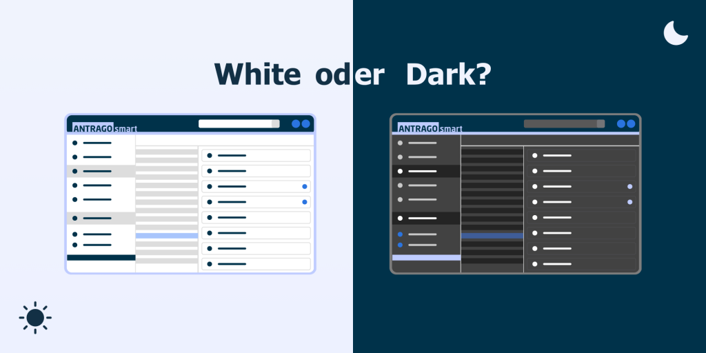 Im hellen oder dunklen Design: ANTRAGO smart bietet neben dem klassischen hellen Layout auch einen Dark Mode. Beide Varianten unterscheiden sich ausschließlich in der Farbgestaltung – die Funktionen und die Bedienung bleiben identisch. Der Wechsel erfolgt direkt in der Oberfläche.