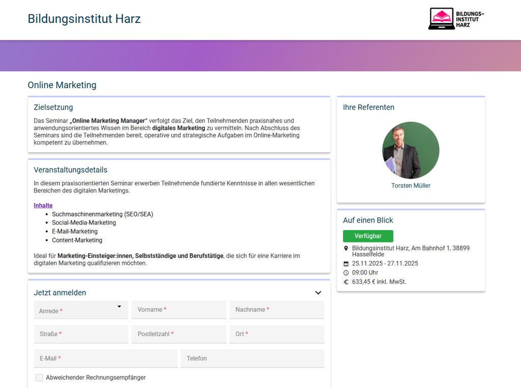 Für Anbietende von Seminaren, Weiterbildungsorganisationen, Akademien, Hochschulen und Bildungseinrichtungen, die Veranstaltungen digital präsentieren, Anmeldungen vereinfachen und wiederkehrende Rückfragen reduzieren möchten.